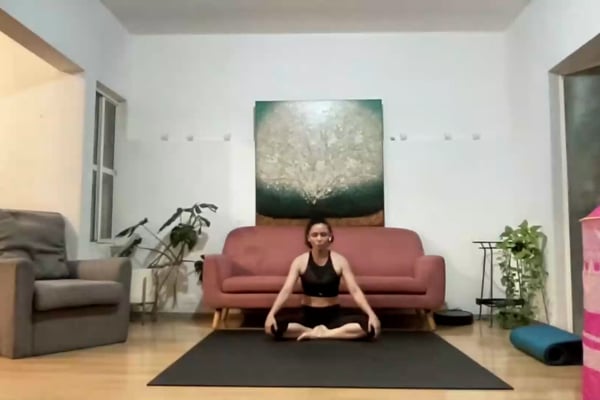 Práctica de secuencia suave a media con énfasis en la profundización de apertura en cadera. La postura objetivo es Samakonasana y Mandukasana. Es posible ocupar colcha, bloques de yoga y la pared.